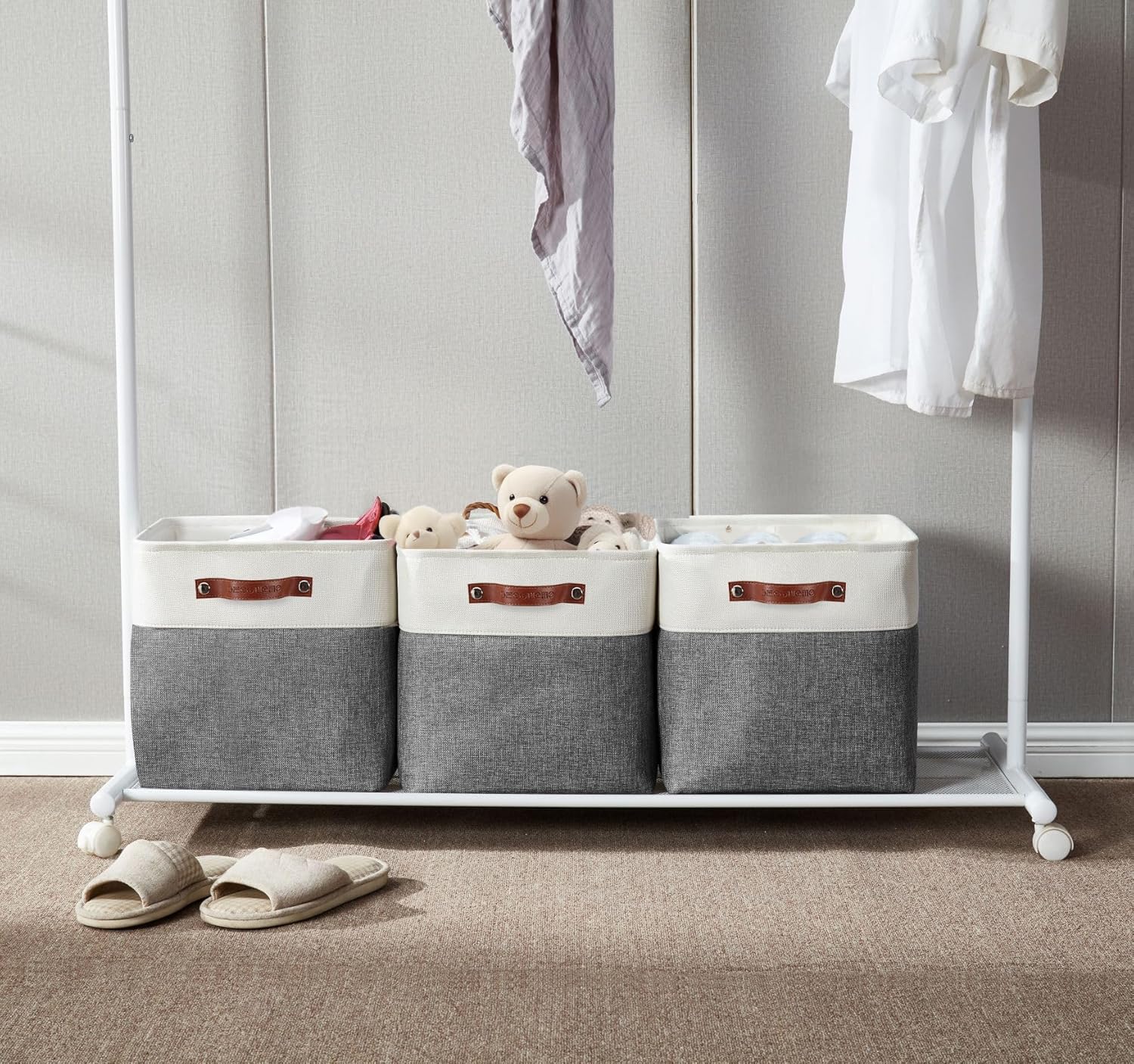 - Durable Cubes Design: DECOMOMO's storage bins feature a sturdy metal frame, extra thick EVA exterior, polyester interior, 2.5mm MDF fiberboard bottom, and faux leather handles capable of holding up to 25 lbs.